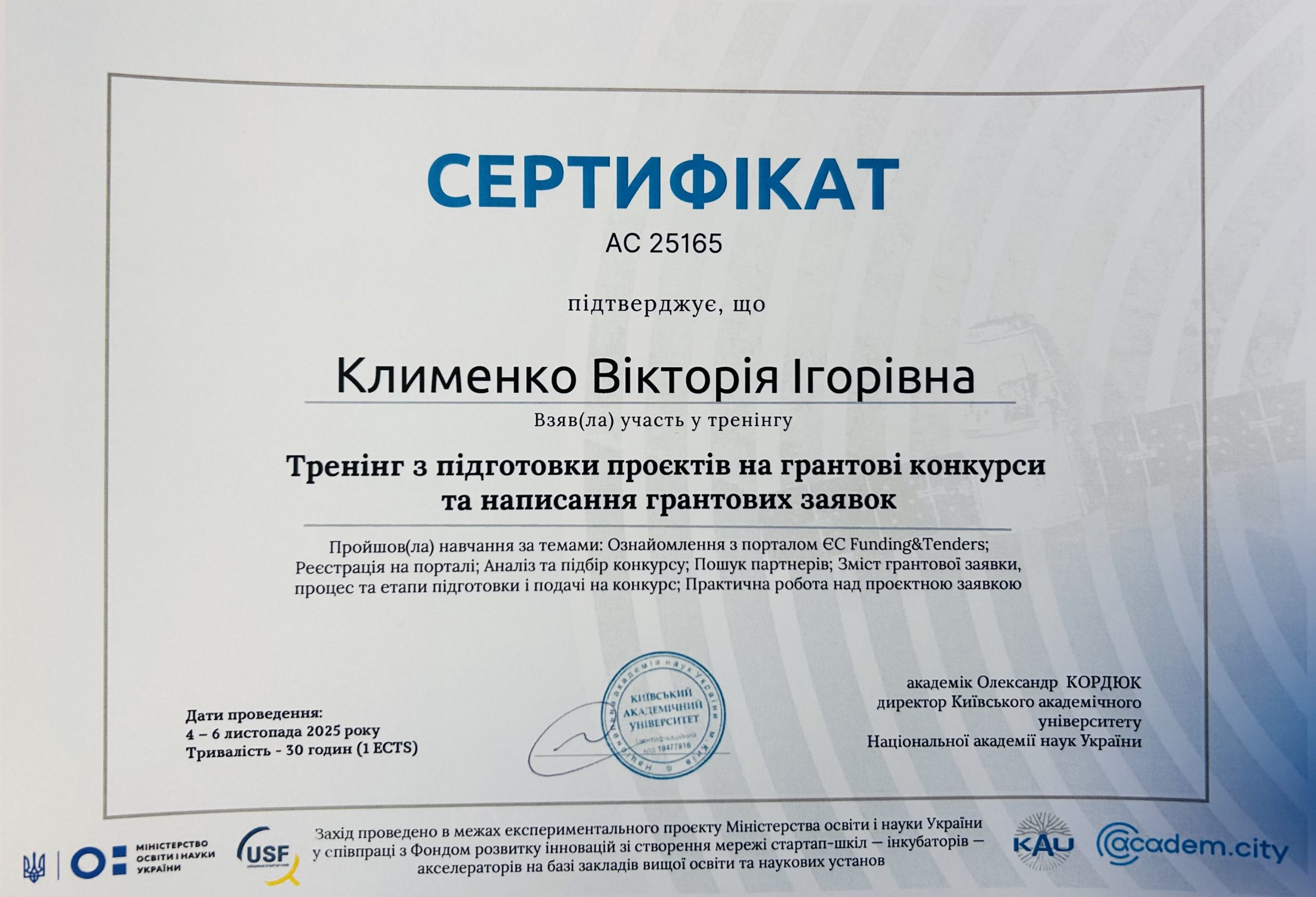From November 4 to 6, 2025, the institute’s Academic Secretary, Candidate of Technical Sciences and Senior Researcher Viktoriia Klymenko, took part in the event “Training on Preparing Projects for Grant Competitions and Writing Grant Applications,” organized by the Kyiv Academic University of the National Academy of Sciences of Ukraine.