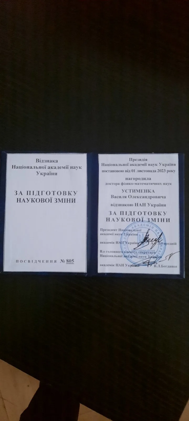 Президія Національної академії наук України постановою від 01 листопада 2023 року нагородила доктора фізико-математичних наук, професора, завідувача відділу інформаційної безпеки Устименка Василя Олександровича Відзнакою Національної академії наук України «За підготовку наукової зміни» як видатного вченого у галузі кібербезпеки, який виховав плеяду науковців у цій галузі та з нагоди 70-річного ювілею.